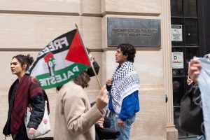 Four police officers observed as the group circled the building’s entrance while chanting, “Trustees, trustees, look at me, we will fight till Gaza’s free” and “Trustees, what trust have you earned, windows shut while Gaza burns.” Around an hour into the protest, students and faculty were unable to enter the building through its turnstiles.