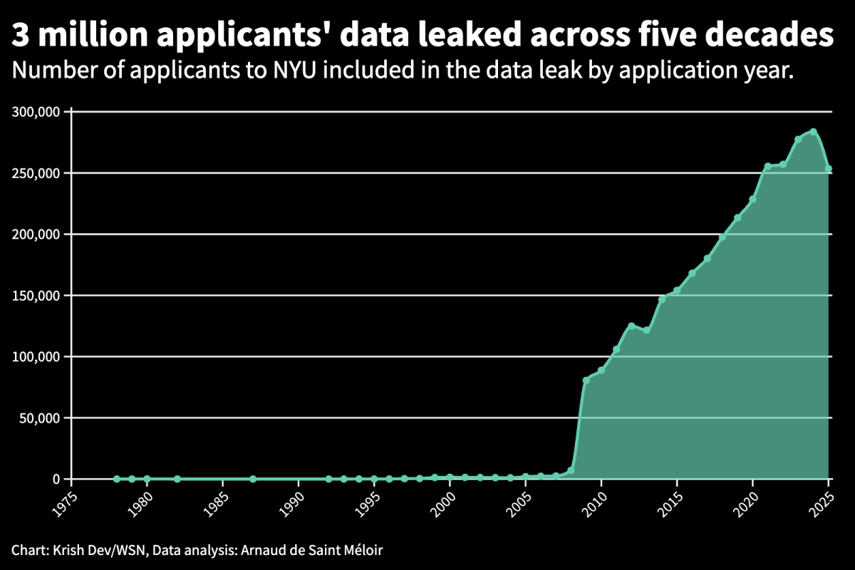 The lawsuits, each filed by an individual applicant, claim that NYU’s cybersecurity practices do not follow guidelines set by the National Institute of Standards and Technology and the Center for Internet Security, leaving those who applied to the school at risk of identity theft. Cybersecurity experts Zack Ganot and Arnaud de Saint Méloir, who help run databreach.com, told WSN that the amount of information included in the files — which were publicly downloadable on NYU’s main website for over two hours — could have sold for tens of thousands of dollars on the dark web.