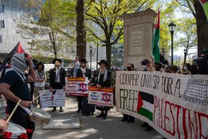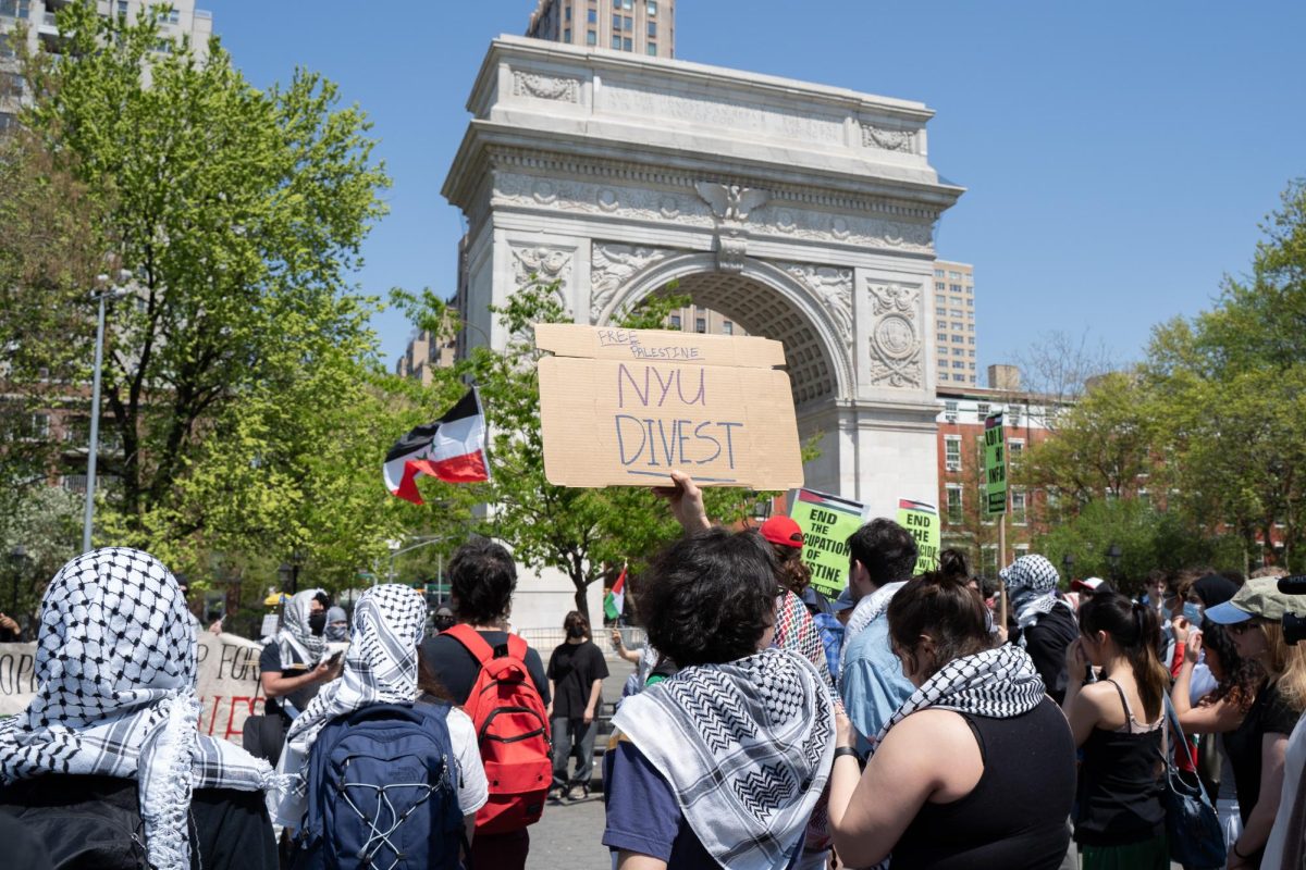 Around 50 students from NYU, The New School and Cooper Union took to Washington Square Park on Thursday afternoon to demand the colleges divest from companies with ties to Israel and pardon students facing disciplinary action for participation in pro-Palestinian protests. The rally was held a year after Gaza Solidarity Encampments swept universities across the nation, and proceeded what’s now a federal crackdown on students who spearheaded the demonstrations.