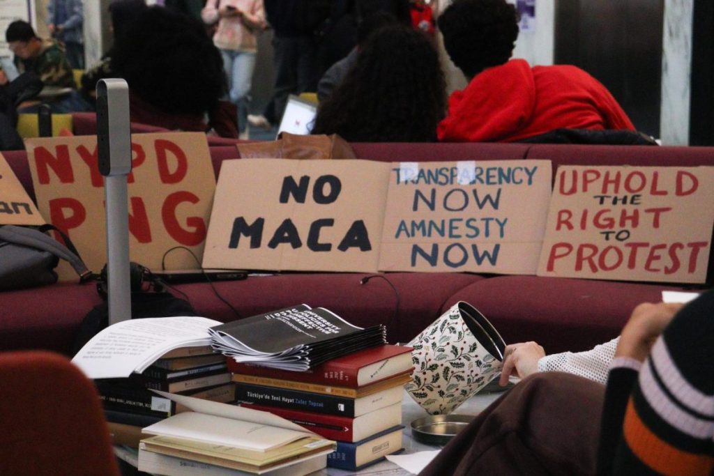 The demonstration was organized by GSOC-UAW Local 2110, which represents over 3,000 graduate student workers, and aims to bring attention to student concerns that they weren’t treated fairly during disciplinary hearings. Participants, some wearing keffiyehs, had signs and stickers reading “NYU amnesty x protections now, or we strike” and “PROTECT STUDENT WORKERS,” and primarily used the space to silently work.